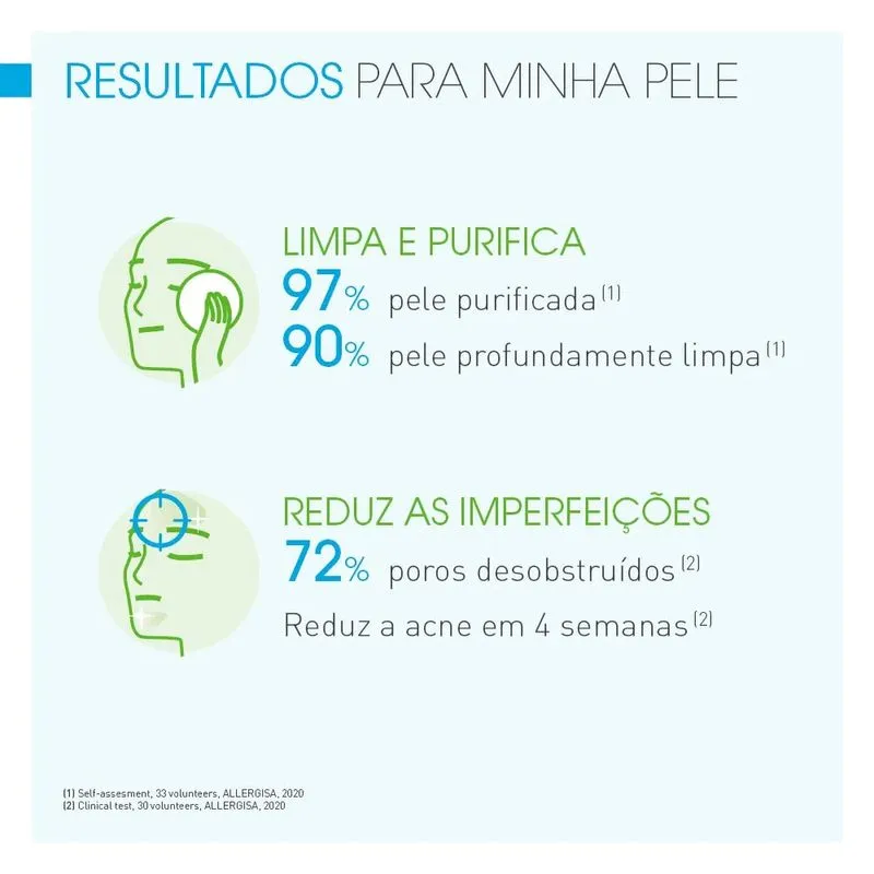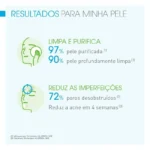 Resultados: desobstrui poros (73%¹), reduz imperfeições da acne (70%¹) e reduz o brilho (79%¹).