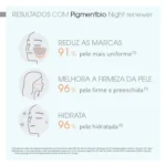 MODO DE AÇÃO BIOLÓGICO: Pigmentbio Night Renewer é o 1º clareador noturno antiidade e antioxidante que renova, uniformiza e revela a luminosidade natural da pele. Sua fórmula traz a patente Lumireveal TechnologyTM, que age em todo o processo biológico da hiperpigmentação para inibi-la desde sua formação, regulando a produção de melanina, até a eliminação das marcas já existentes através de uma intensa renovação celular que revela a luminosidade original da pele. Pigmentbio Night Renewer ainda conta com ação antioxidante e hidratante para prevenir o envelhecimento precoce e fortalecer a barreira de proteção da pele, graças à combinação de vitaminas C, E e Niacinamida. A eficácia antiidade do Hexapeptídeo-2 aumenta a produção de colágeno para uma aparência renovada, uniforme e mais firme desde a manhã seguinte. TEXTURA INOVADORA: sleeping mask – máscara de uso noturno fresca, leve e confortável, à base de água. Benefícios: Em apenas 1 semana: pele mais firme, preenchida, hidratada e mais uniforme. Modo de Uso: Aplique Pigmentbio Night Renewer à noite no rosto e pescoço após limpeza com a Pigmentbio H2O ou Pigmentbio Foaming Cream. Pode ser usado isoladamente ou após Pigmentbio C-Concentrate.